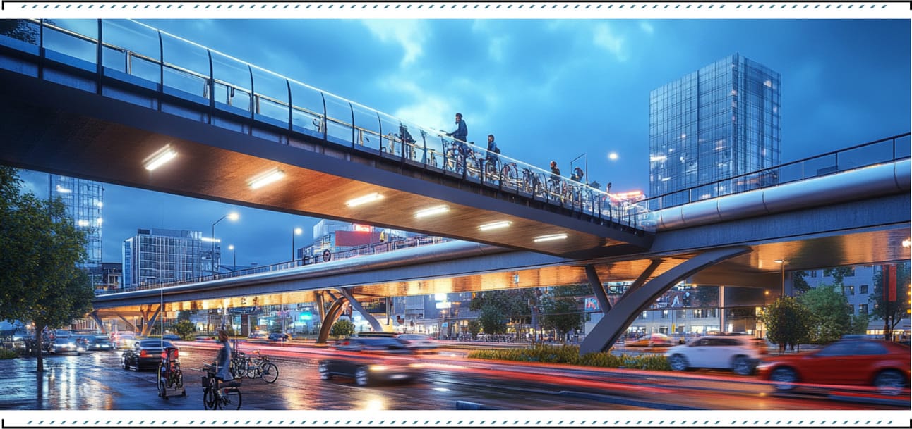 You are a lead structural engineer responsible for designing a new pedestrian bridge in a rapidly growing urban area. The bridge needs to span a busy intersection, providing a safe crossing for both foot and bike traffic.