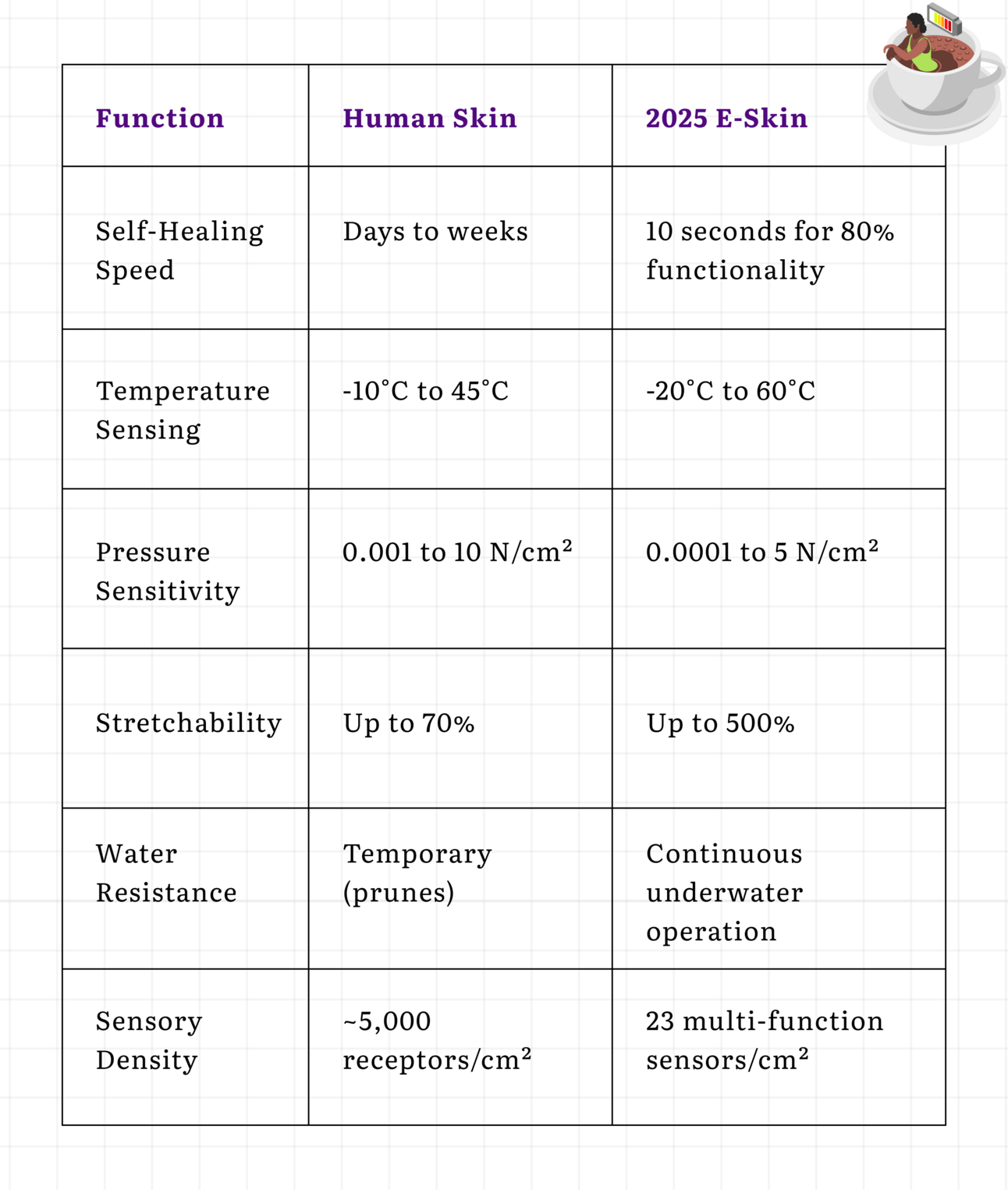 For prosthetics and human-machine interfaces, understanding how E-skin compares to human skin is crucial for seamless integration and user comfort.