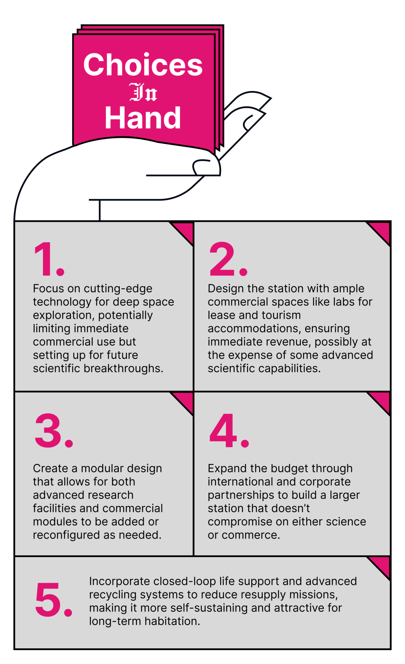 You’re the lead engineer for a multinational space agency tasked with designing a new orbital space station. This station must serve as a hub for deep space missions, scientific research, and potentially support commercial activities. It’s crucial to balance the technological needs for space exploration with the commercial viability to attract funding and partnerships.